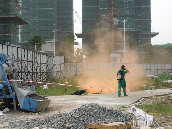 演練開始。首先,2652111搶險電話接到莆田市萬科城溪園小區(qū)(尚濟路)北側(cè)建工地的施工單位的報警。該單位因進行小區(qū)綠化平整工程建設(shè)的需要,動用挖掘機施工,卻因?qū)芫€位置的不熟悉而盲目操作,致使我司敷設(shè)在工地內(nèi)的De110預(yù)留中壓管被鏟斷,造成燃氣大量泄露,現(xiàn)場白霧彌漫,并發(fā)出較為強烈的氣流聲。公司管網(wǎng)部門接到報警后,立即將事故初步情況上報有關(guān)領(lǐng)導(dǎo),并啟動公司緊急預(yù)案。緊接著,調(diào)控中心立即對事故搶險人員和突發(fā)事故應(yīng)急處理各小組人員進行調(diào)度并協(xié)調(diào)宏盛市政工程公司做好搶修準(zhǔn)備。我司調(diào)控中心亦配合客服部向用戶發(fā)布緊急停氣通知。接到通知后,各搶險和事故處理人員立即趕往事故現(xiàn)場。到達現(xiàn)場后,工作人員馬上疏散場外圍觀群眾,拉起警戒線,對有效區(qū)域隔離警戒;搶險人員佩戴安全設(shè)備進入事故現(xiàn)場,查找泄漏點,并及時對事故點進行搶修。各搶險和事故處理小組各司其職,相互配合,經(jīng)過多方搶修,事故最終得到解決。最后,總指揮指示客服部門向各小區(qū)用戶及物業(yè)管理發(fā)送短信通知恢復(fù)供氣,并通知人員撤離和解除緊急警報訊號。