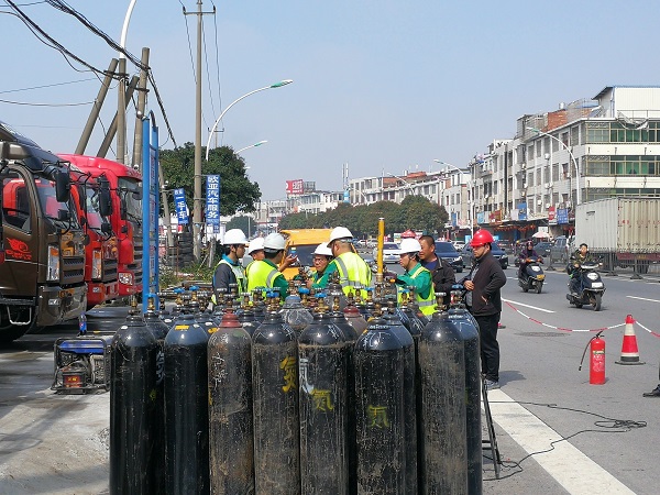 在面臨施工會(huì)直接影響到涵江區(qū)域天然氣供應(yīng)的情況下,公司啟動(dòng)了天然氣供應(yīng)管理應(yīng)急預(yù)案。經(jīng)過(guò)與海油福建站線和新能源公司的溝通協(xié)調(diào),調(diào)動(dòng)了公司應(yīng)急氣化裝置,于涵西站內(nèi)進(jìn)行LNG氣化保供,同時(shí)對(duì)洞湖口路段受影響的工業(yè)用戶協(xié)豐模具啟動(dòng)了LPG瓶組供應(yīng)方案。
